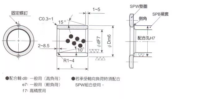 • 自潤 #500SP襯套(SPB)在回轉、搖擺及往復運動均可使用。