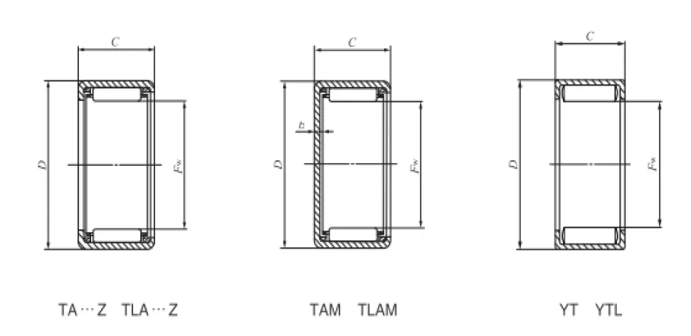 | 軸徑mm | 標準型代號 | 重量(g) | 一端密封型 | 重量(g) | 標準型代號 | 重量(g) | 一端密封型 | 重量(g) | 保持潤脂型 | 重量(g) | Fw | D | C | t2 Max | max | min | max | min | max | min | C kgf | Co kgf | rpm | 軸徑mm | |